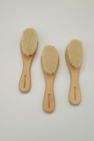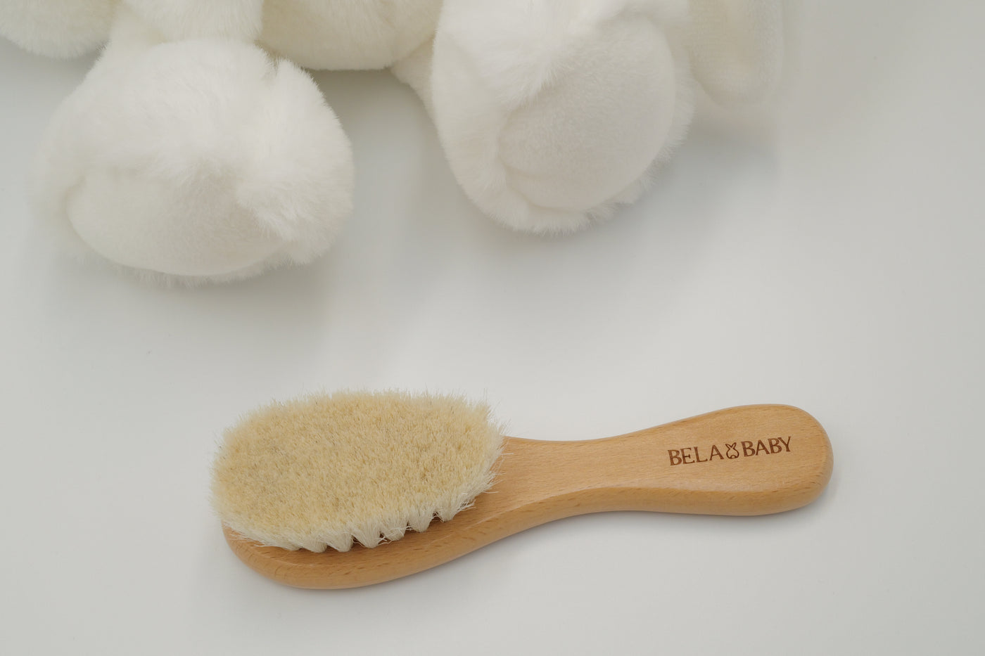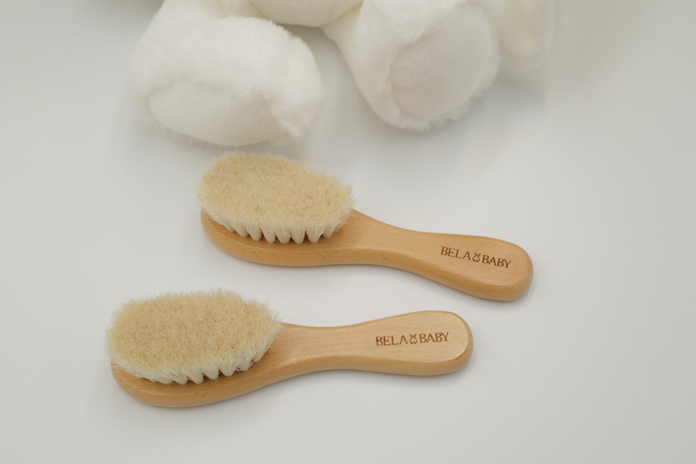 Cepillo de pelo hecho 100% de madera natural y con cerdas suaves para el cuero cabelludo de recién nacidos.