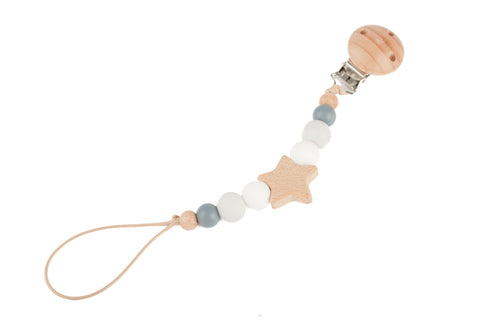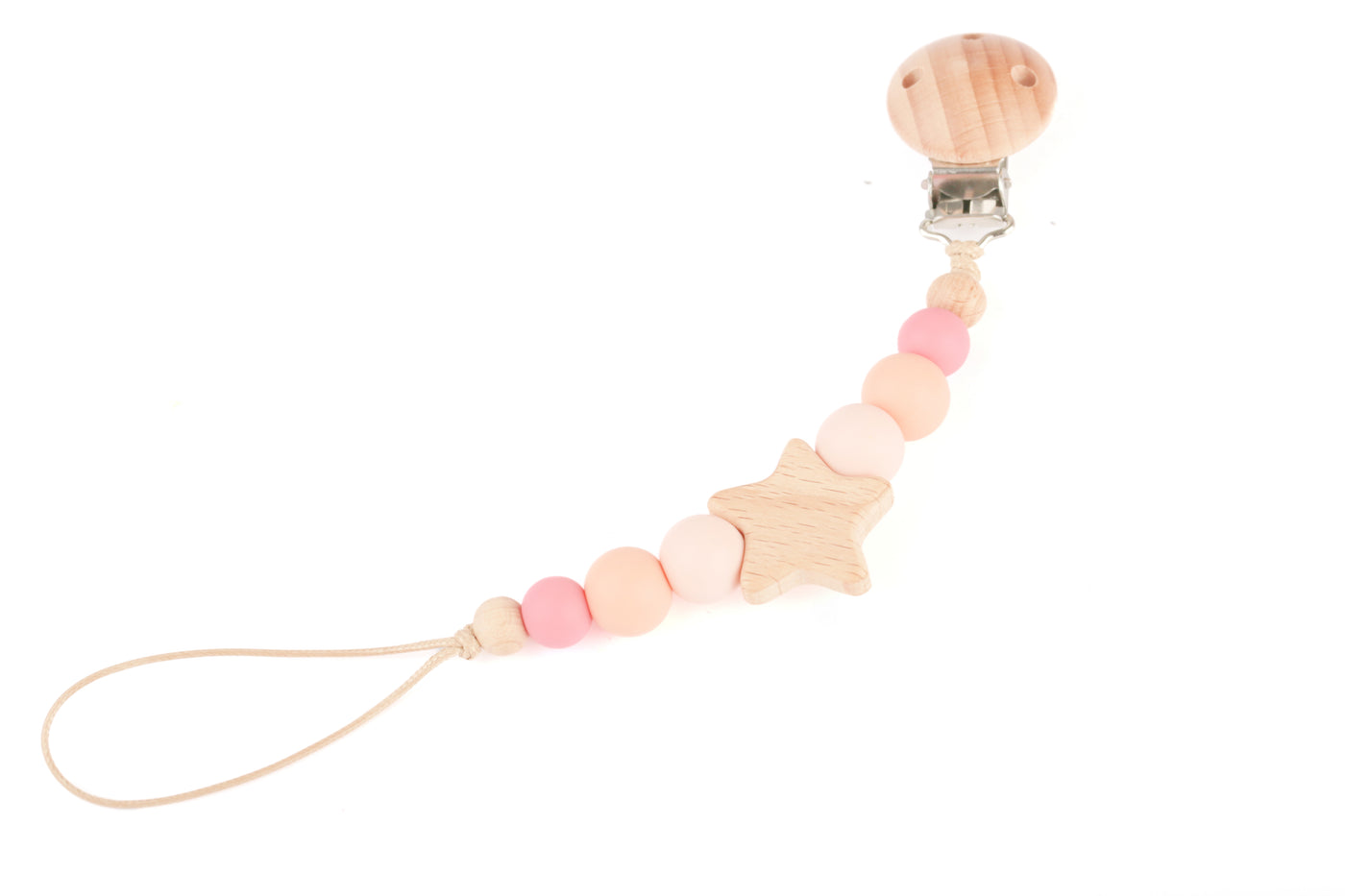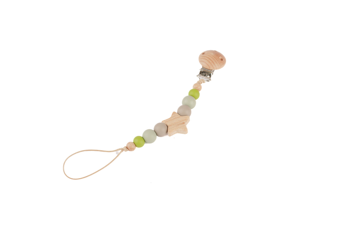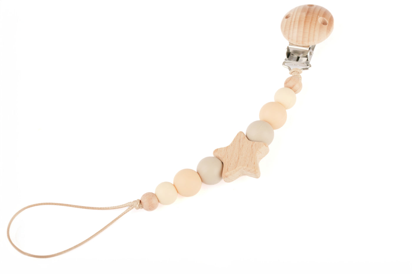 Portachupón de silicona para bebe de grado alimenticio, libre de tóxicos como BPA y ftalatos con detalles de estrella y clip en madera natural.