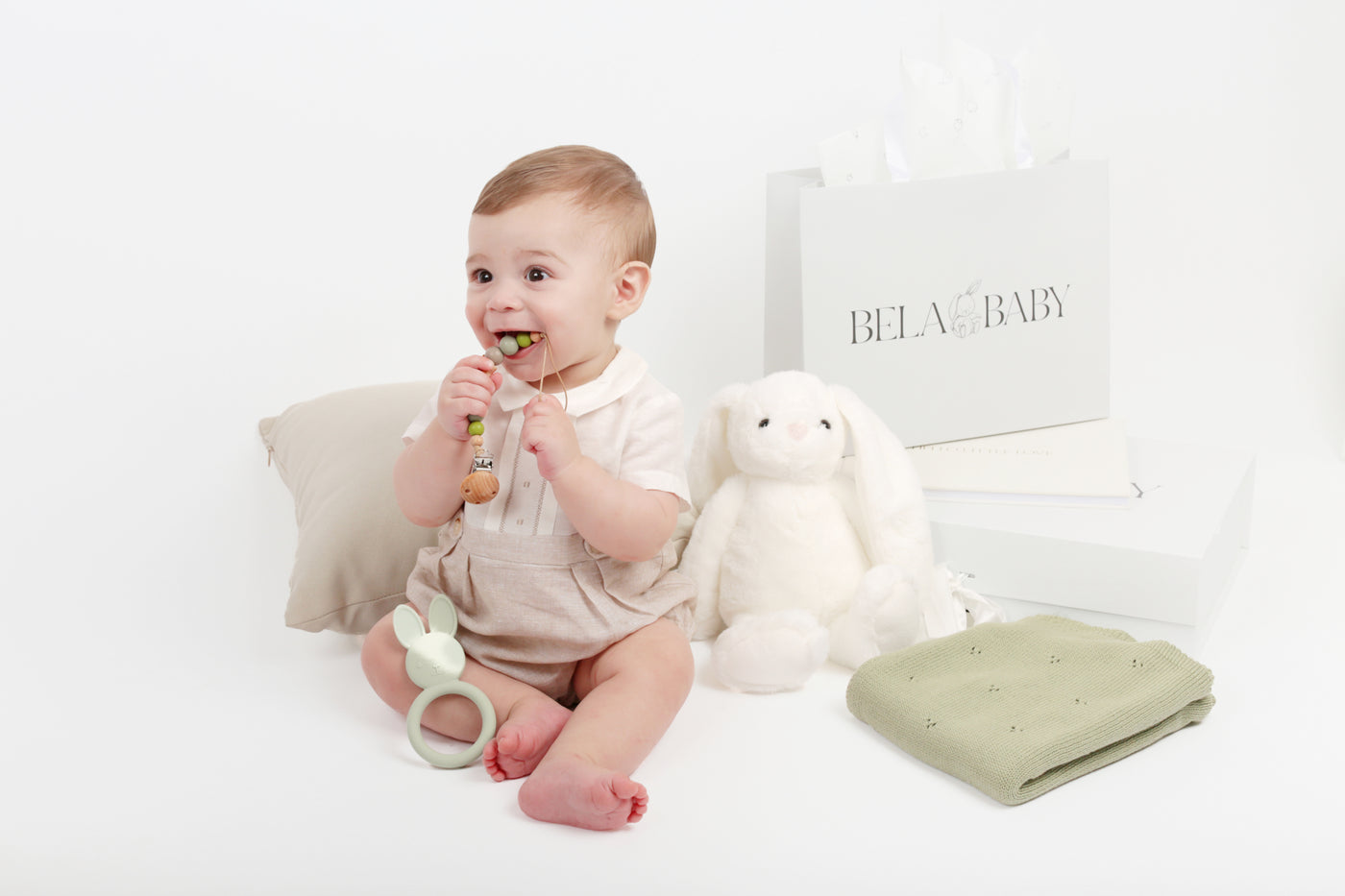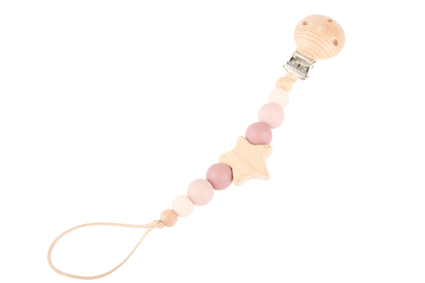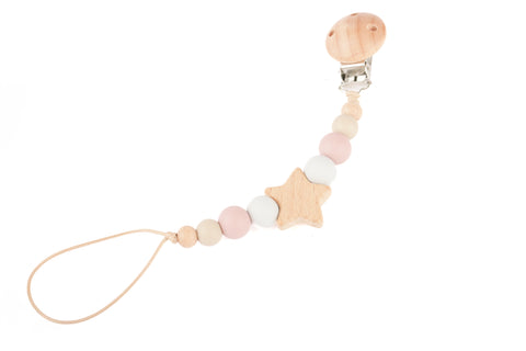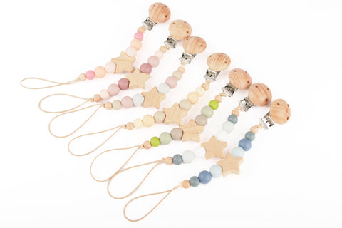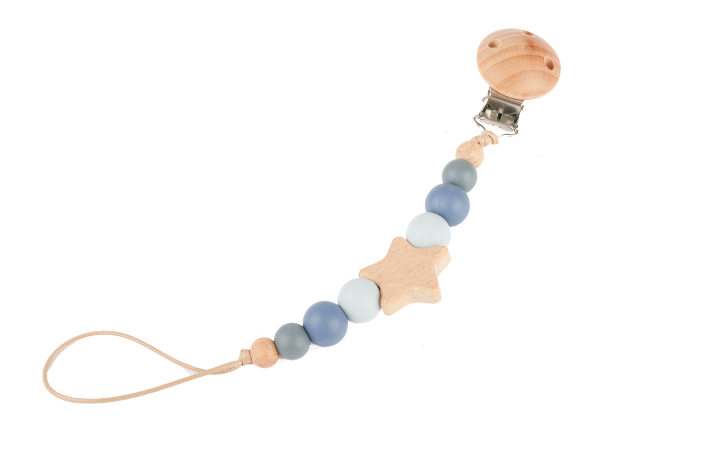 Portachupón de silicona para bebe de grado alimenticio, libre de tóxicos como BPA y ftalatos con detalles de estrella y clip en madera natural.